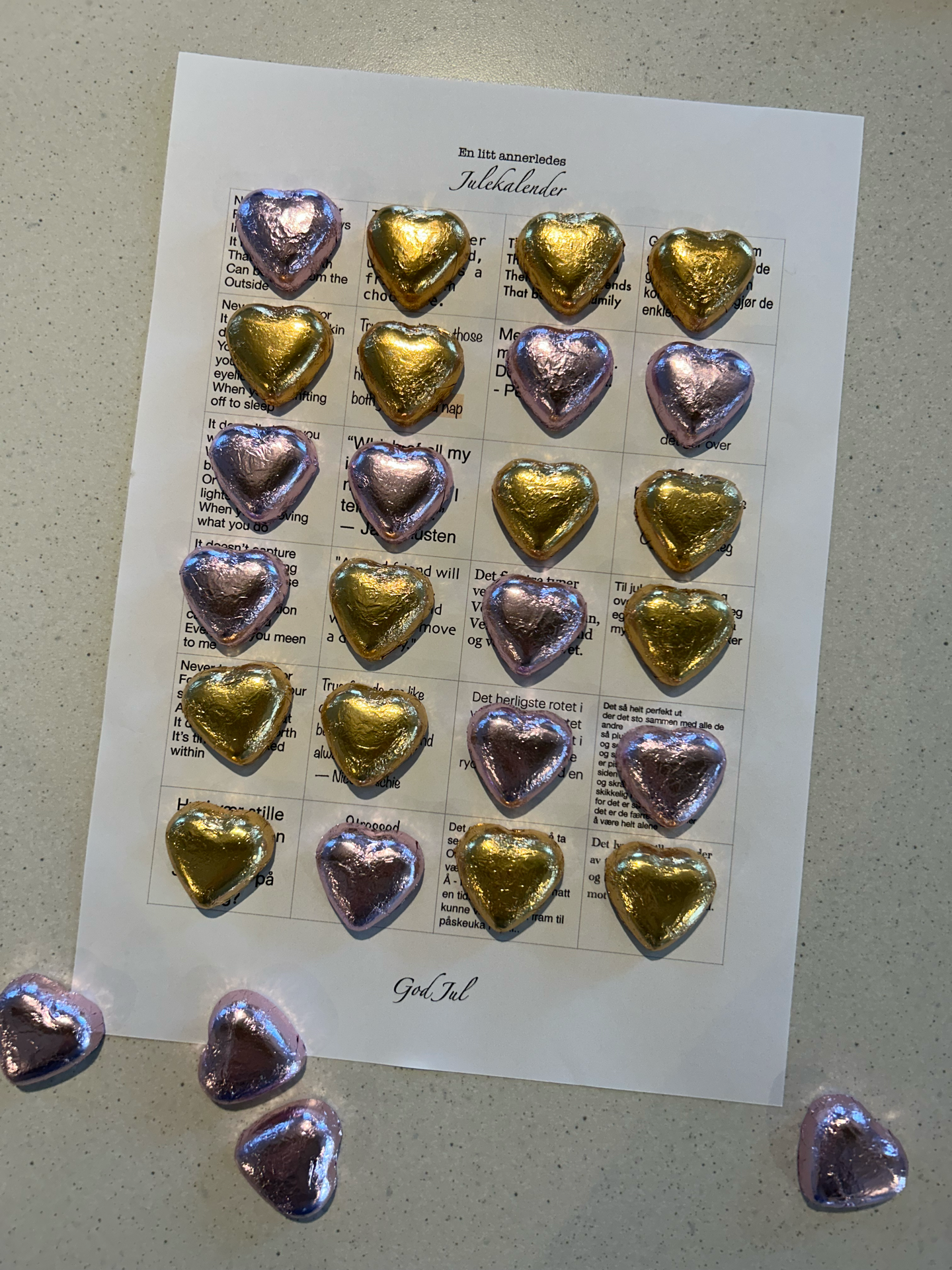 Print ut julekalenderen og sett arket inn i en tom ramme evt lim den på en papp-plate i A4 størrelse. Kjøp inn sjokoladehjerter,(jeg kjøpte de på apoteket(røde) og Nille (rosa og gull). Lim de fast med Tack-it.